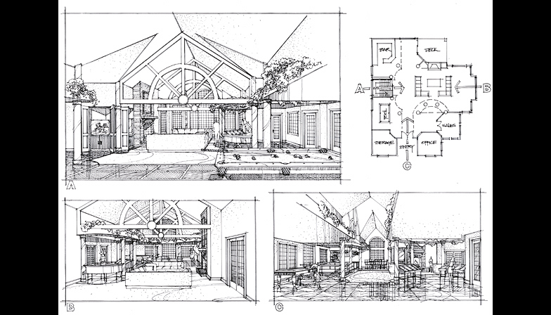 A series of black and white line art views for a clubhouse design.