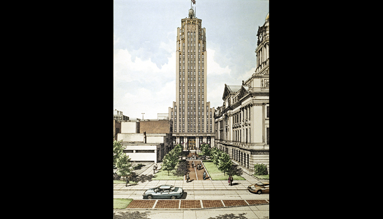 between the courthouse and the bank building in the center.