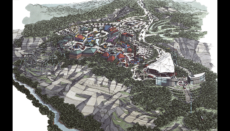 ...a design for a proposed amusement park in Branson, featuring also a condo dev't, golf course and office towers with performing arts center. This is the sort of design phase artwork that simply CANNOT be economically developed on a computer.