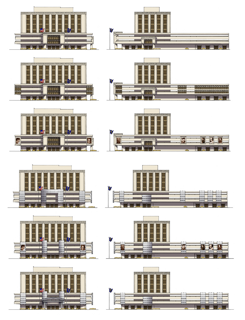 Here's the scoop. ..after being called in to clean the interconnecting 10 ton exterior limestone panels ( not shown ), the architects found that 40+ years of road salts spilling across the floors of the enclosed parking garage floors had corroded the panel attachment points and connecting beams to the point of imminent collapse. Not expecting to deal with a major overhaul of the building , I was asked to provide some ideas on how to dress the building back up, using minimal construction, as the idea of replacing the existing wall panels was prohibitive on numerous counts. The designs also center around giving the building a sense of entry, which it lacked previously, as well as maintaining some sense of its' identity, and design cohesiveness. The top designs create an entry that borrows from, and supplements the existing design vocabulary. The bottom designs are based around the possibility of providing a quick solution that admits that the design is an addition to the building, and makes no attempt to hide that fact, through bolted on perforated metal panels, which are spaced with rythmic and practical considerations to the existing facade. This was a viable alternative for 2 reasons: 1.) The solution was originally conceived to be a temporary fix. 2.) If it were to become a permanent solution, the clients wanted a more modern and 'festive', consumer friendly facade, than the previous staid and rather generic appearance. |