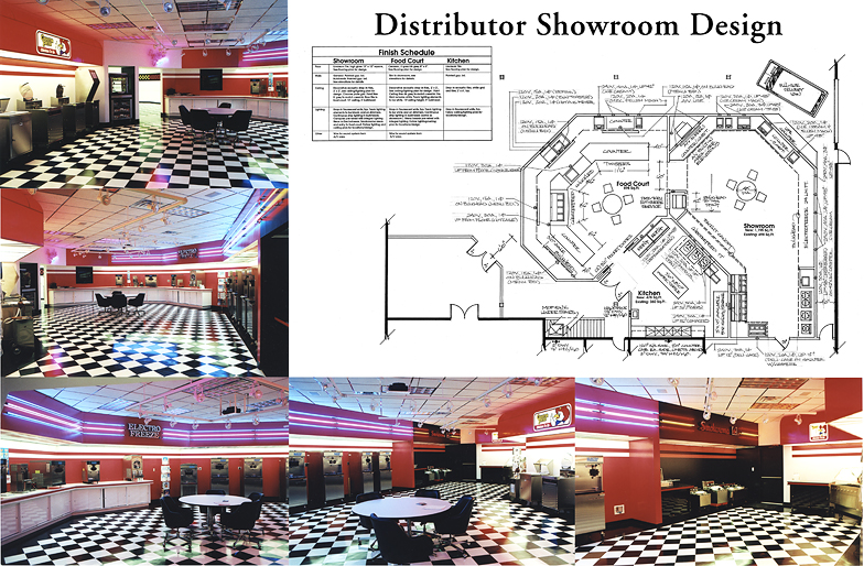 a flashy sales center to sell his products from, that was also functional. His requirements also included a checkered floor and neon. Working within those parameters and the confines of an existing space and budget, I created the floor plans, specified the mechanicals, drew up the construction documents and color coded the various product areas to match the individual manufacturers color identities while combining them all into a homogenous, albeit very flashy presentation. The owner was very happy with his new installation and credited it to his sales growth, noting that he has the 'best damn salesroom in the country'