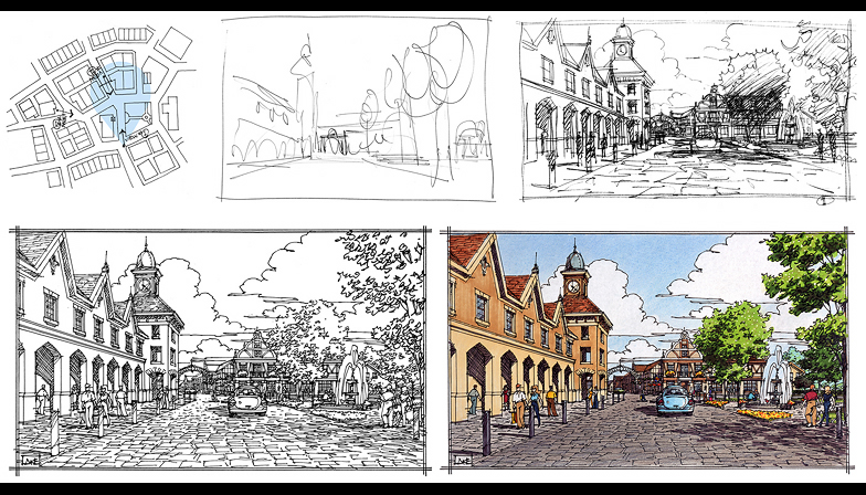 This was a fun project. Given the site plan ( top left ) and asked to determine good angles of view, I chose 3 different ones, and produced the fast thumbs for conceptual approval ( top middle ). Thence proceeding to flesh them out a little more, I arrived at the bottom right with a concept rendering that expressed the architectural flavor that the architect was looking for. |