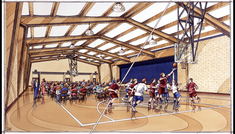 Q. Hey! Can ya draw people playing basketball and attending a service at the same time? A. Well sure I can...as long as the preacher doesn't mind intermitant whistle blowing. |
