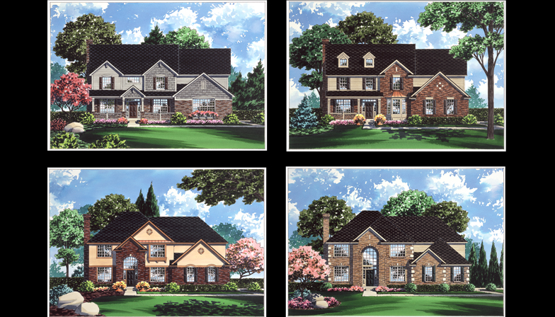 ....4 homes in a rendered elevation style, penciled and watercolored.