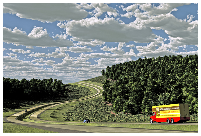 ...OF COURSE I CAN DO A HIGHWAY! ..and here is my sample with MY TRUCK & LOGO bringing home the goods! If it can be built in reality, I can build it in Virtual Reality..and then some... ....if you need a flying car....NO PROBLEMO! |