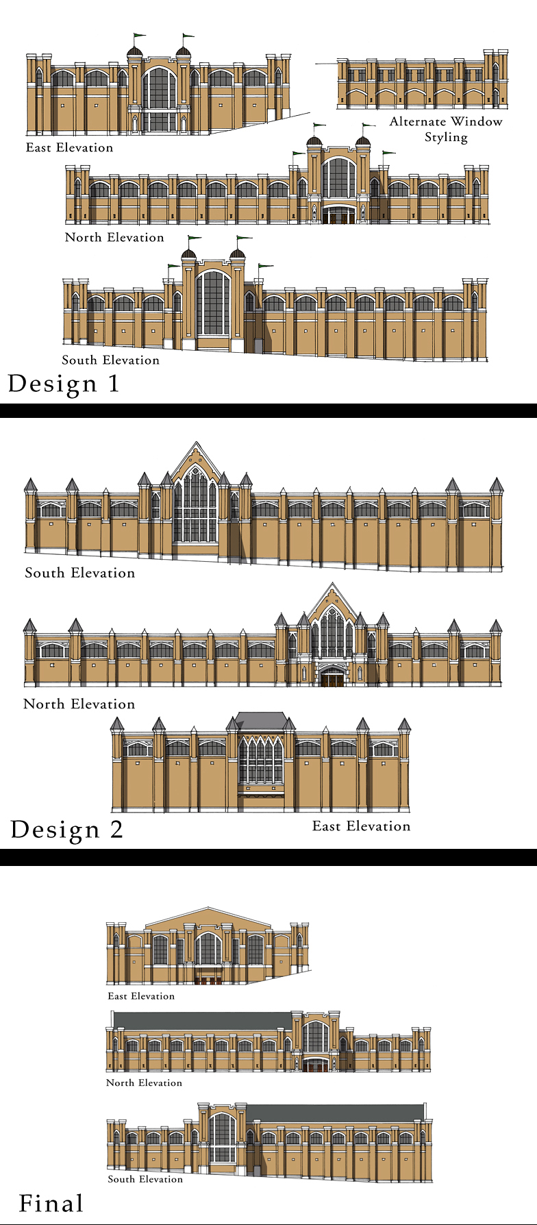 I was given a floor plan only and was to base these upon Notre Dames existing collegiate gothic styling of the surrounding buildings. These are the 2 designs that I submitted with the final selection and alteration. |